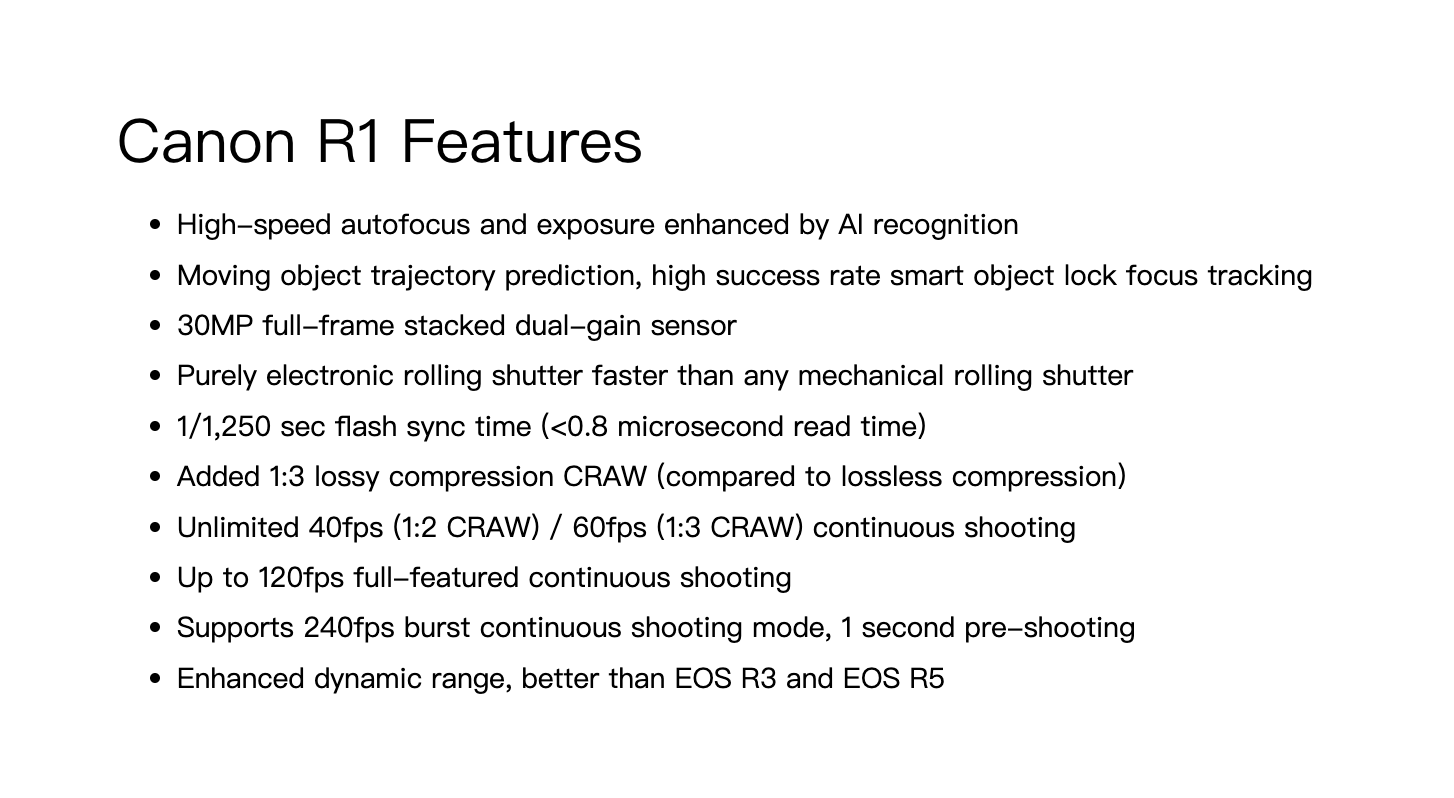 Autofocus and AI Enhancements: Canon is emphasizing autofocus performance, integrating AI for enhanced speed and exposure accuracy. The R1 includes moving object trajectory prediction and smart object lock focus tracking, promising a high success rate.