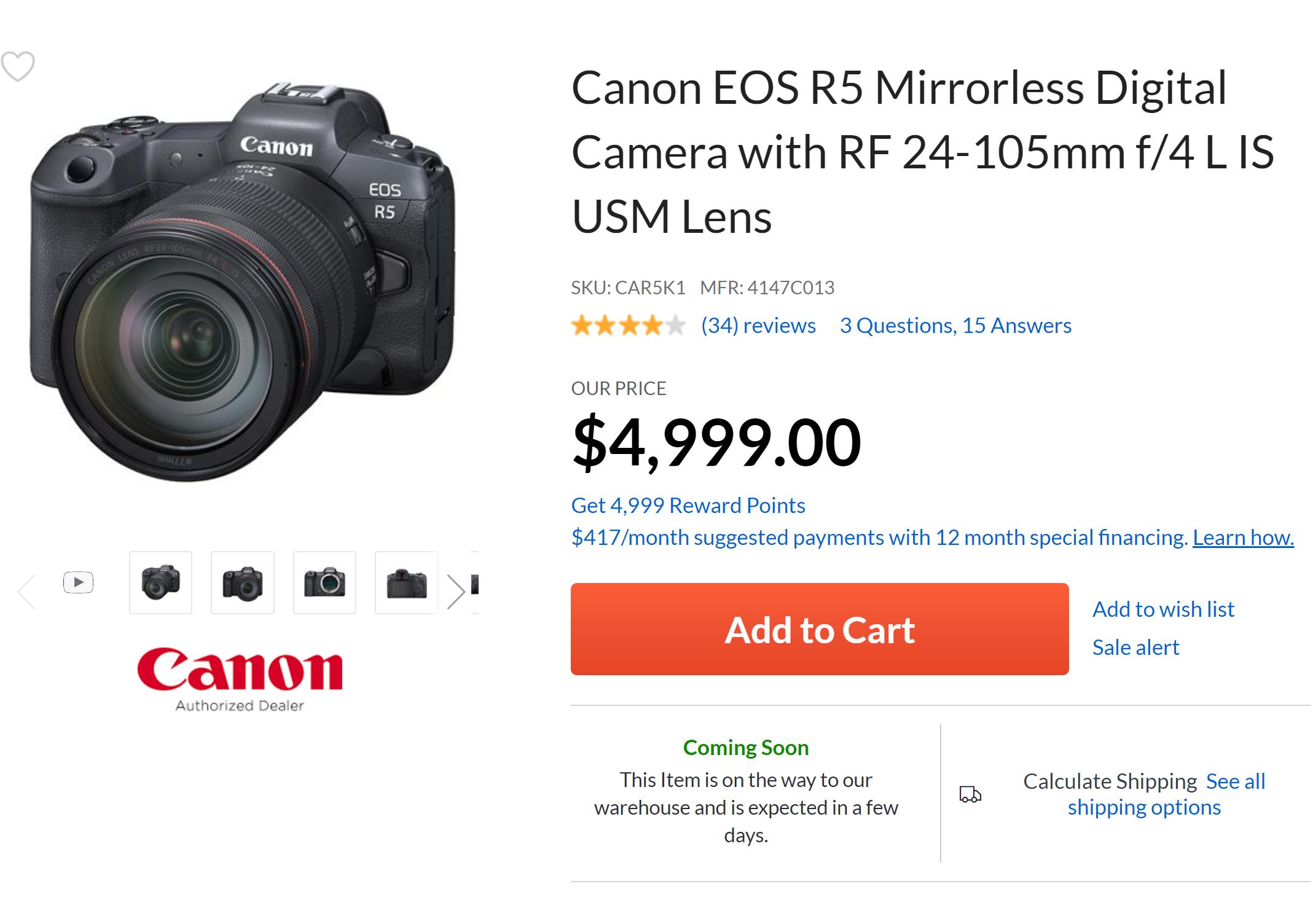 Canon EOS R5 w/ RF 24-105mm f/4L IS USM Lens Kit – $4,999.00 – “Coming Soon” (This Item is on the way to our warehouse and is expected in a few days.) – at Adorama