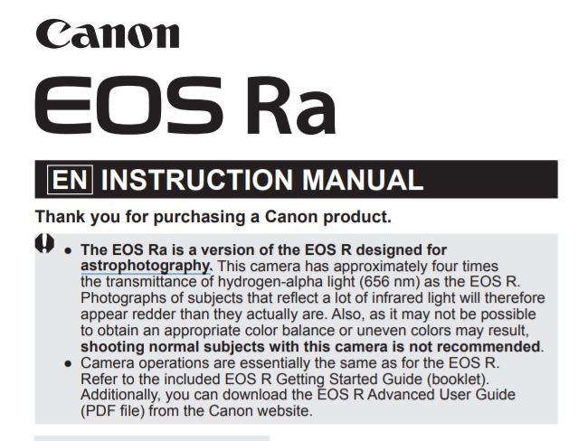 • The EOS Ra is a version of the EOS R designed for astrophotography. This camera has approximately four times the transmittance of hydrogen-alpha light (656 nm) as the EOS R. Photographs of subjects that reflect a lot of infrared light will therefore appear redder than they actually are. Also, as it may not be possible to obtain an appropriate color balance or uneven colors may result, shooting normal subjects with this camera is not recommended. ..