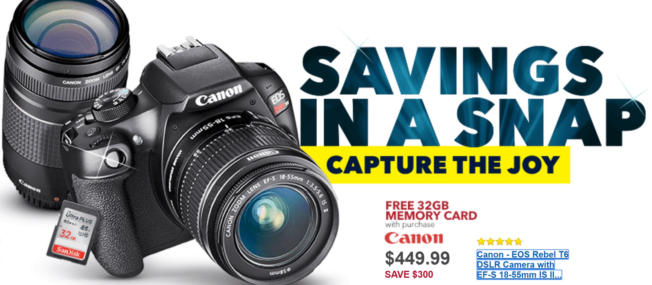 According to leaked Black Friday Ads around the web, the Canon’s best selling Black Friday camera will be Canon EOS Rebel T6 w/ 18-55mm lens & 75-300mm lens bundle. At Black Friday 2017, the price for this bundle will be $449.00, $300 off than regular price.