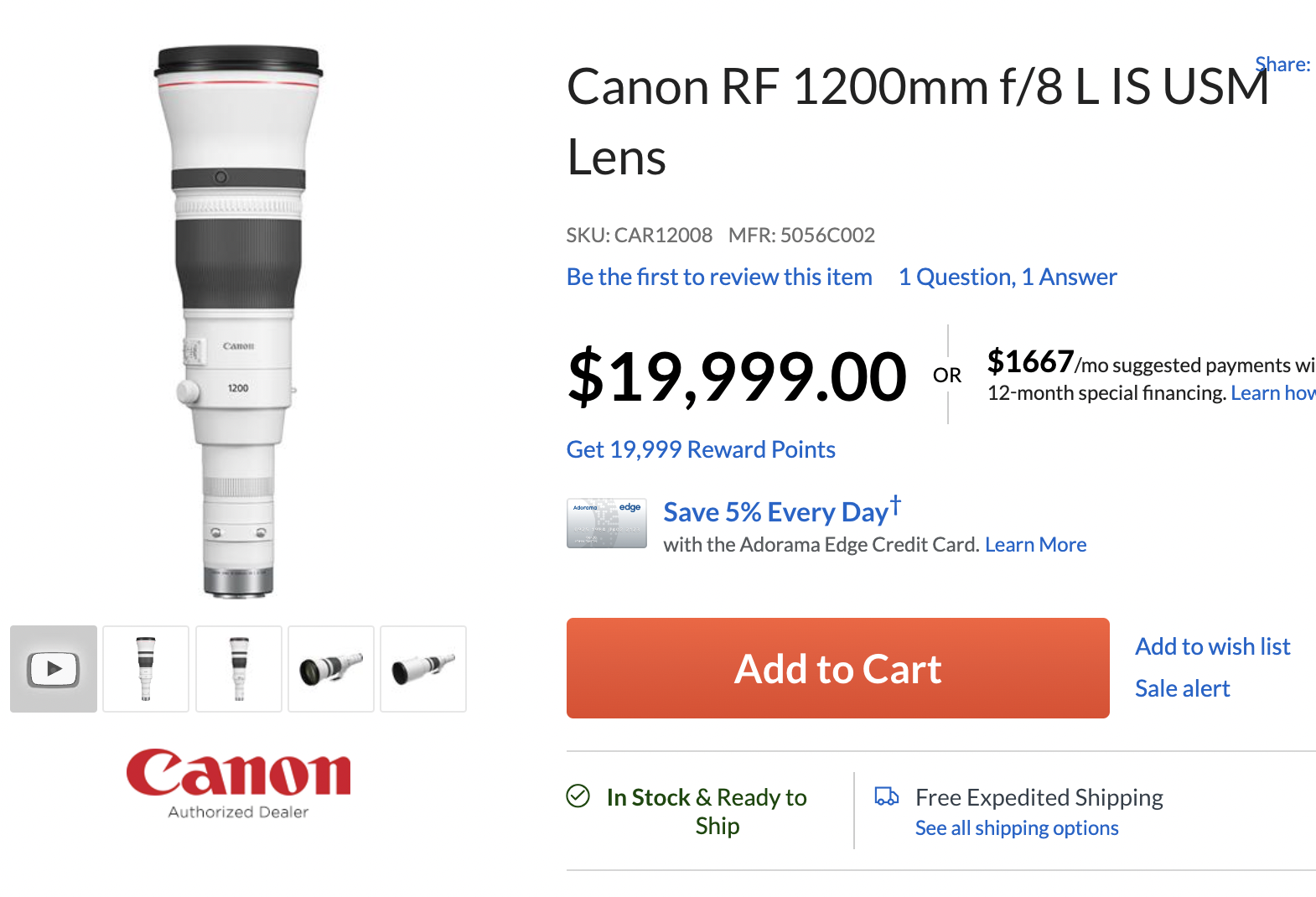 The new released Canon RF 1200mm f/8L IS USM lens now finally in stock and shipping at Adorama. Order ASAP before sold out.
