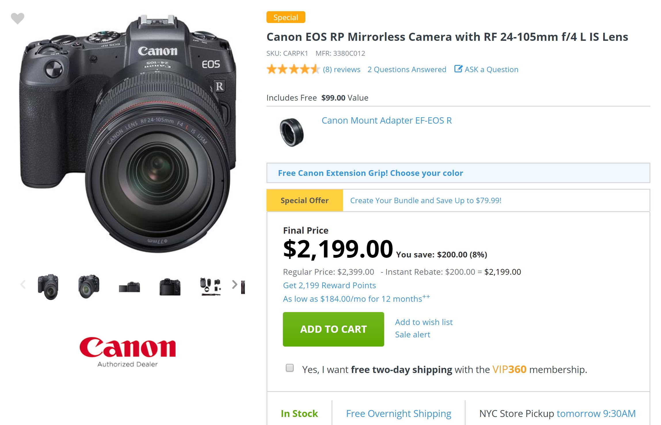 - Canon EOS RP with Canon RF 24-105mm f/4L IS USM Lens + Free Mount Adpater + Free Grip – $2,199.00 – at Amazon/B&H Photo/Adorama