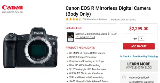 Canon USA authorized dealer Focus Camera currently offers free Sony SF-G Series 64GB Class 10 UHS-II SD Card when you buy EOS R body ande EOS R Body w/ 24-105mm Lens kit. The Sony SF-G Series 64GB Class 10 UHS-II SD Card costs $119.00. Canon EOS R body and kit is in stock at Focus Camera right now.