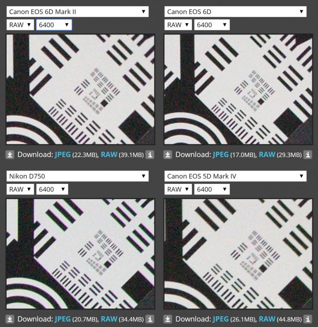 From the high ISO test result at ISO 51200, we can clearly see that EOS 6D Mark II has worst high ISO result compared to EOS 6D, Nikon D750 and EOS 5D Mark IV.