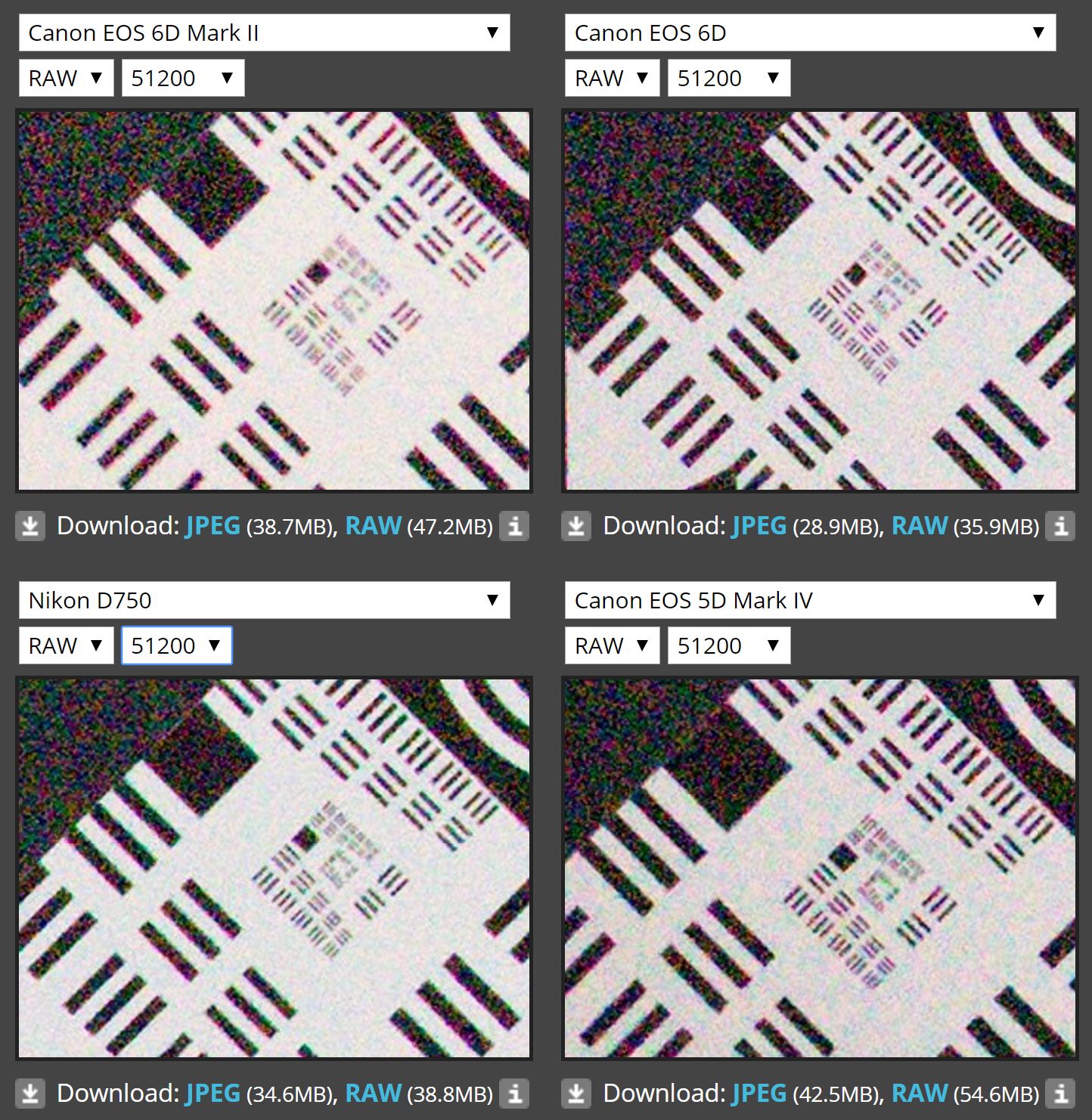 From the high ISO test result at ISO 51200, we can clearly see that EOS 6D Mark II has worst high ISO result compared to EOS 6D, Nikon D750 and EOS 5D Mark IV.