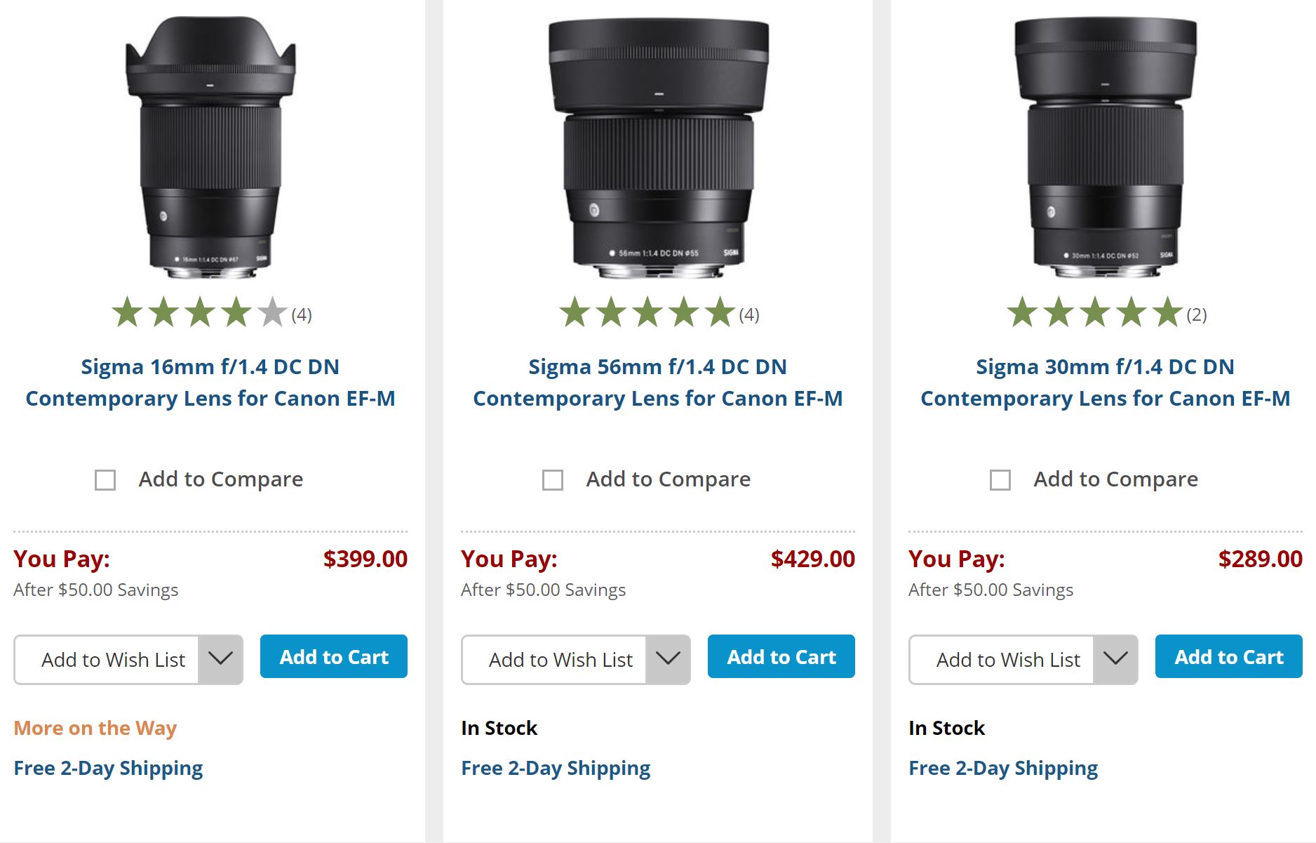 The Sigma 16mm, 30mm, 56mm f/1.4 DC DN Contemporary lenses for Canon EF-M mount now $50 off at B&H Photo Video, Adorama, Amazon, Focus Camera.