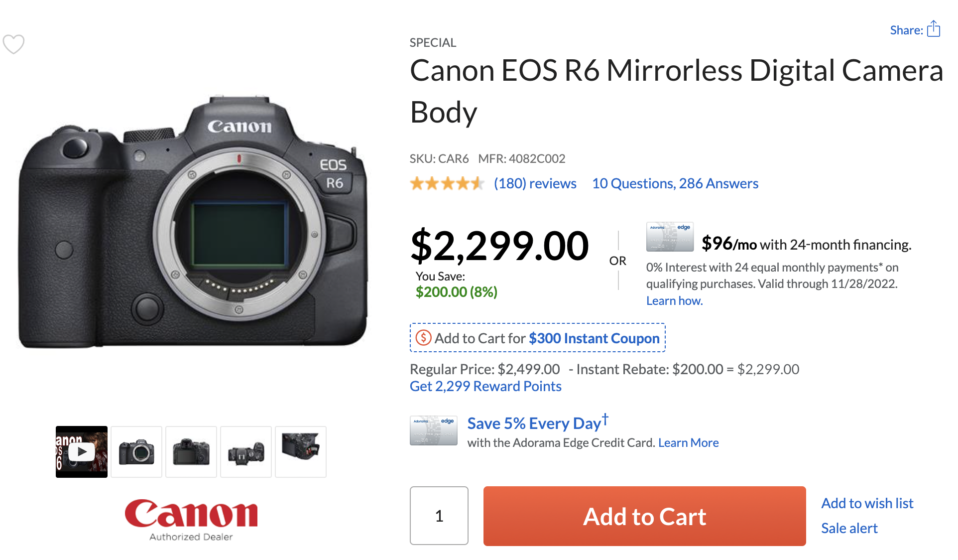 Adorama camera currently has EOS R6 body for $1,999 after $300 instant rebate when add to cart. Currently lowest price online ever.