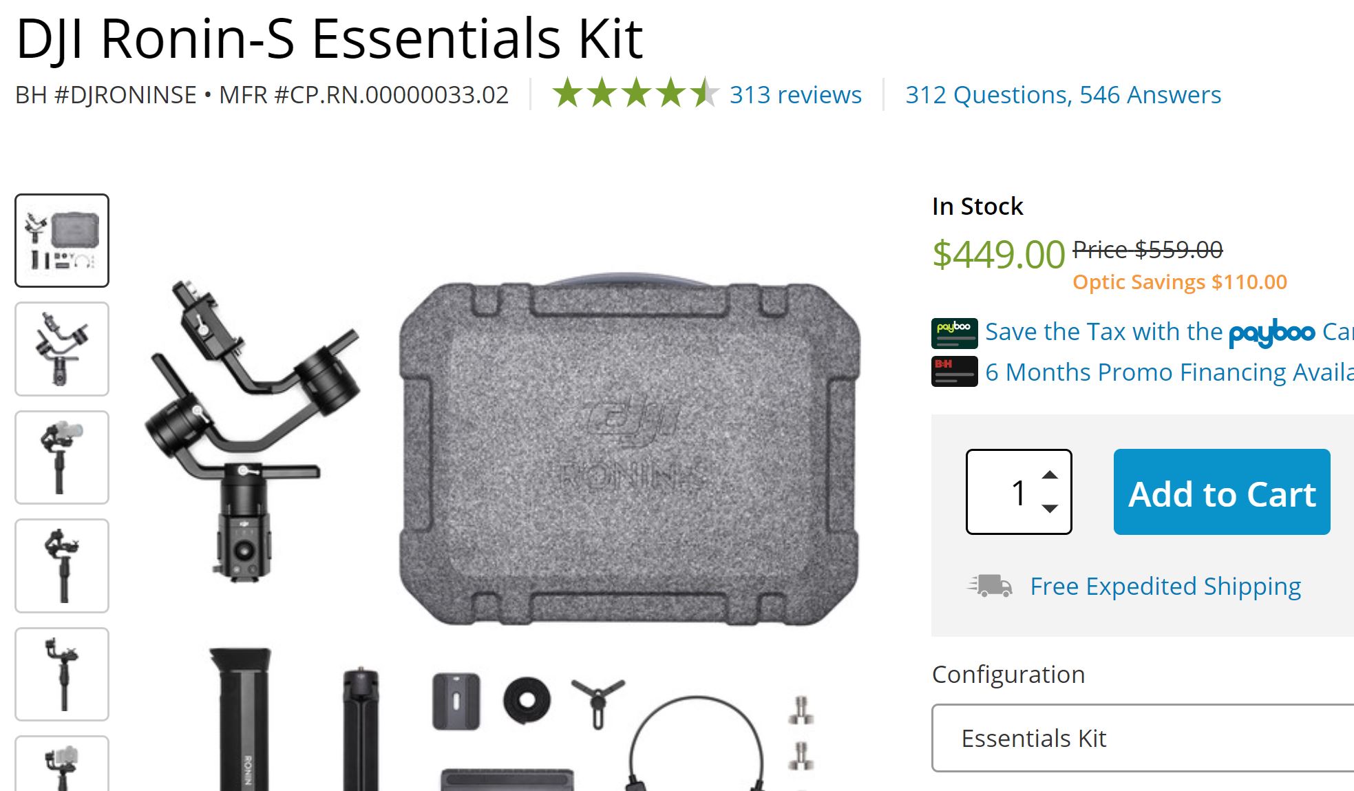 Today, B&H Photo Video has a very hot deal on DJI Ronin-S Essentials Kit for $449. This is currently best deals online ever. $110 off than regular US price at Adorama. Order ASAP before deal is expired.
