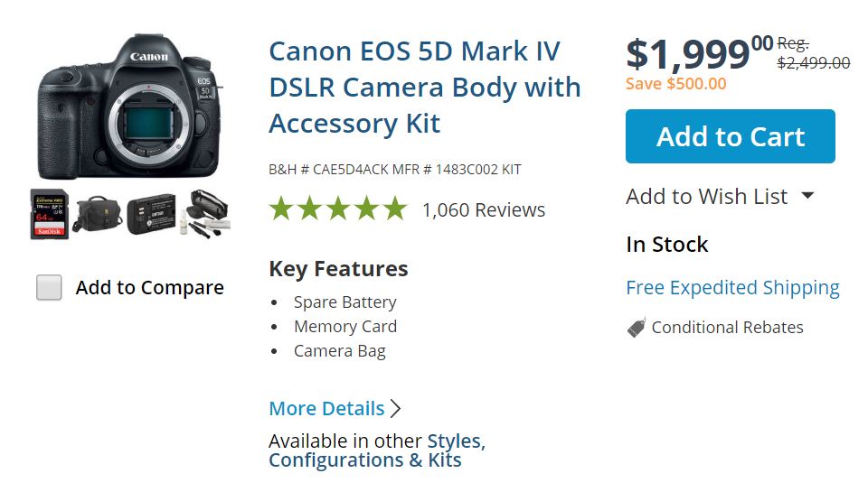 - Canon EOS 5D Mark IV Body – $1,999 – at B&H/Amazon/Adorama