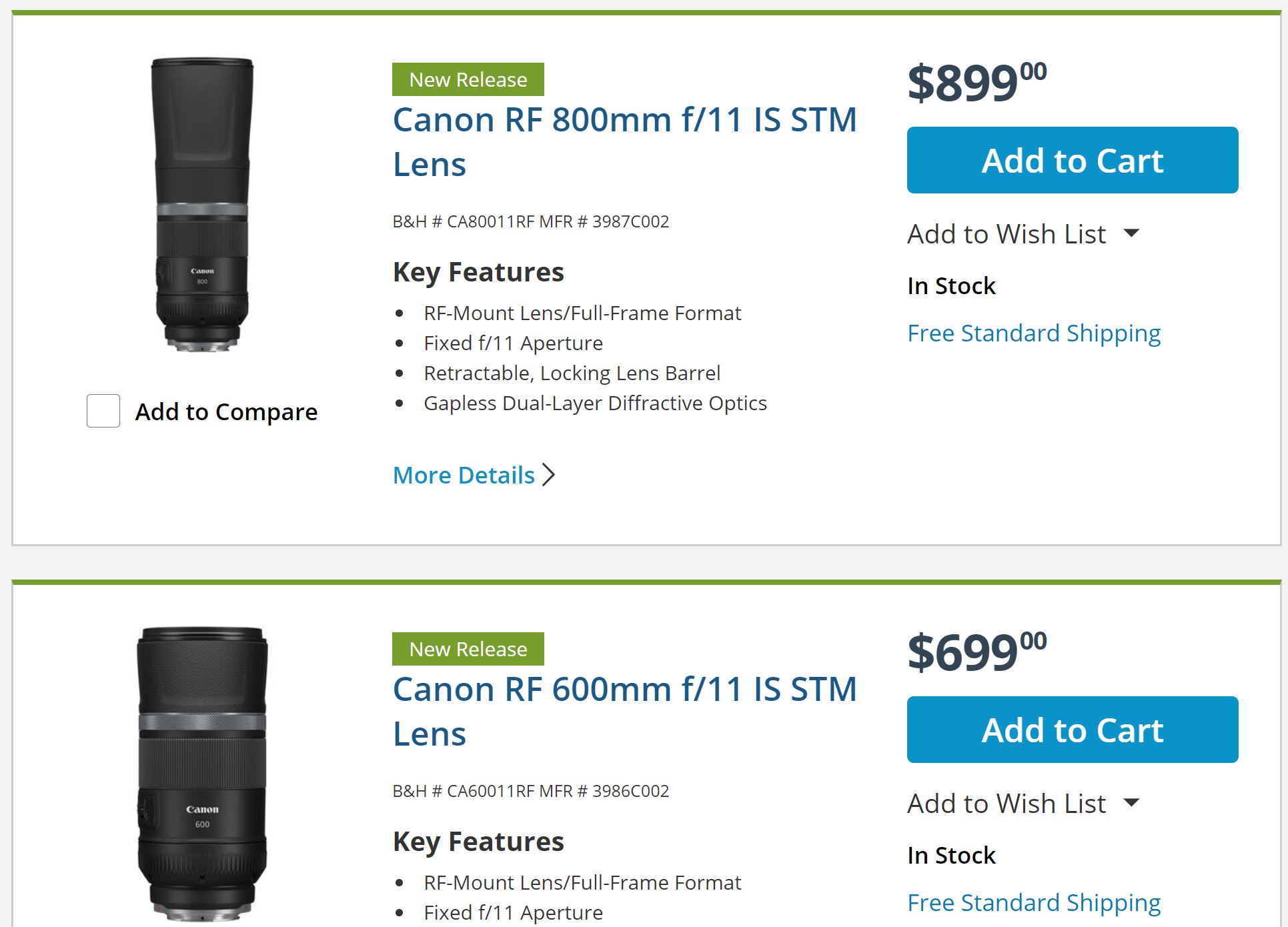 In Stock Now: RF 600mm f/11, RF 800mm f/11, Extender RF 1.4x & 2x, WFT-R10, LP-E6NH
