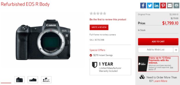 - Refurbished Canon EOS R Body – $1,799.10 – at Canon Direct Store (1-Year Canon USA Warranty)