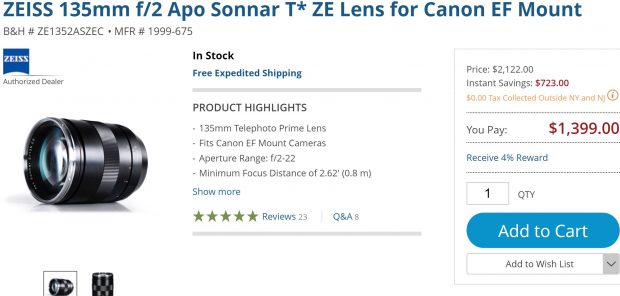 - ZEISS 135mm f/2 Apo Sonnar T* ZE Lens for Canon EF Mount – $723 Off – at B&H Photo Video