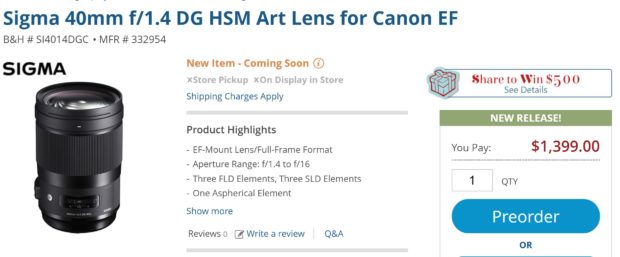 The new announced Sigma 40mm f/1.4 DG HSM Art lens (B&H Photo/Adorama) now available for pre-order online. The  US price for this lens is $1,399. The release date for this lens is on November 22nd.