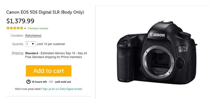Woot ! (An Amazon Company) currently has refurbished Canon EOS 5DS body for $1,379.99. Lowest price online ever. Regular price new EOS 5DS is $3,499 today. This refurbished item also coming with 90-day USA warranty from Woot !.