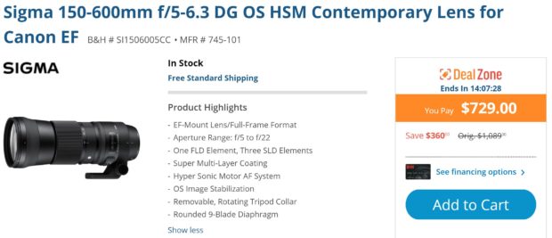 - Sigma 150-600mm f/5-6.3 DG OS HSM Contemporary Lens for Canon EF mount – $729.00 – at B&H Photo Video