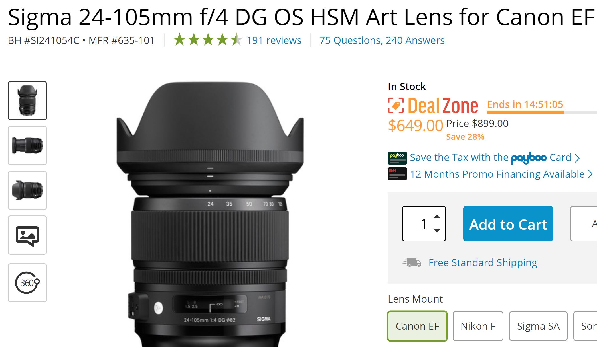 B&H Photo Video today has a hot one day deal on Sigma 24-105mm f/4 DG OS HSM Art Lens for Canon EF mount for $649.00. Currently lowest price online ever. Regular US price for this lens is $899 at most US stores.
